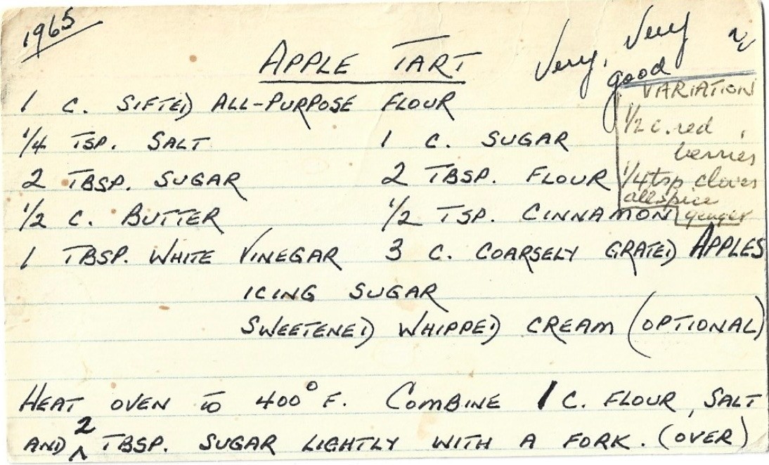 My Nani’s handwritten 1965 Apple Tart recipe, which calls for coarsely grated apples.